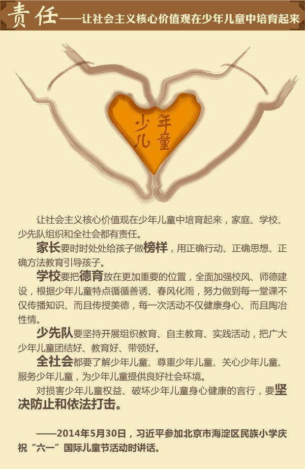 让社会主义核心价值观在少年儿童中培育起来,家庭、学校、少先队组织和全社会都有责任。家长要时时处处给孩子做榜样,用正确行动、正确思想、正确方法教育引导孩子。要注意观察孩子的思想动态和行为变化,善于从点滴小事中教会孩子欣赏真善美、远离假丑恶。学校要把德育放在更加重要的位置,全面加强校风、师德建设,根据少年儿童特点循循善诱、春风化雨,努力做到每一堂课不仅传播知识、而且传授美德,每一次活动不仅健康身心、而且陶冶性情。少先队要坚持开展组织教育、自主教育、实践活动,把广大少年儿童团结好、教育好、带领好。全社会都要了解少年儿童、尊重少年儿童、关心少年儿童、服务少年儿童,为少年儿童提供良好社会环境。对损害少年儿童权益、破坏少年儿童身心健康的言行,要坚决防止和依法打击。