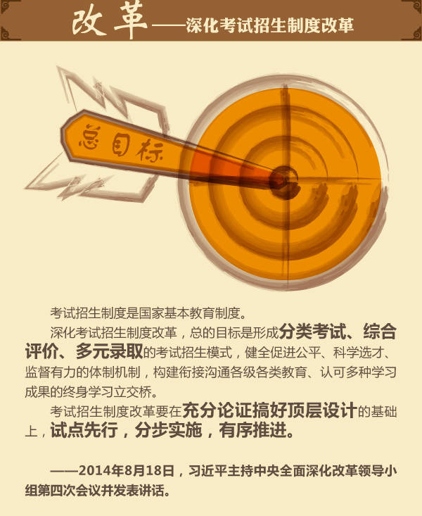 考试招生制度是国家基本教育制度。总体上看,我国考试招生制度符合国情,同时也存在一些问题。必须通过深化改革,促进教育公平、提高人才选拔水平,适应培养德智体美全面发展的社会主义建设者和接班人的要求。深化考试招生制度改革,总的目标是形成分类考试、综合评价、多元录取的考试招生模式,健全促进公平、科学选才、监督有力的体制机制,构建衔接沟通各级各类教育、认可多种学习成果的终身学习立交桥。考试招生制度改革要在充分论证搞好顶层设计的基础上,试点先行,分步实施,有序推进。