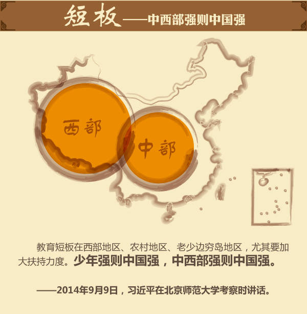 目前,教育短板在西部地区、农村地区、老少边穷岛地区,尤其要加大扶持力度。少年强则中国强,中西部强则中国强。